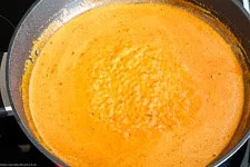 - Direkt im Anschluss den Bratensaft in der Pfanne (je nach Pfannen-Oberfläche viel oder wenig) mit Sahne ablöschen, kurz aufkochen Hitze reduzieren und mit dem Tomatenmark, Curry, Salz und Pfeffer abschmecken und kurz zur Seite stellen.