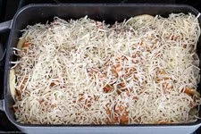 - und zum Schluss streust Du den geriebenen Käse darüber. Im vorgeheizten Backofen für 20-30 Minuten auf der mittleren Schiene goldbraun überbacken.