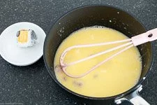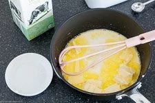 - Als erstes die Milch in einem Topf lauwarm erwärmen und vom Herd nehmen. Die Butter und den TL Zucker unterrühren und auflösen.