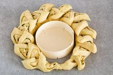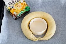 - Die Teigrolle vorsichtig (mit der "Naht" nach unten) auf ein Backblech mit Backpapier legen, um die Ofenkäse-Holzschachtel zu einem Kreis formen und die Enden verschließen, in dem Du sie etwas zusammen knetest. Den Käse legst Du erst einmal wieder in den Kühlschrank. BITTE BEACHTE: Sollte die Teigrolle nicht ganz um die Ofenkäse-Holzschachtel passen, diese leicht mit den Händen zu einer längeren "Wurst" ausrollen. Es sollte ungefähr 1 cm Platz zwischen Holzschachtel und Teig sein.