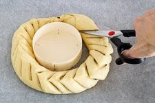 - Nach 10 Minuten den Brotkranz mit Ofenkäse aus dem Ofen holen und den Ofenkäse über Kreuz einschneiden, die Ecken nach außen klappen und alles für weitere gute 15 Minuten in den Ofen zurück geben und weiter backen.