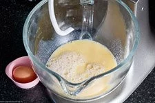 - Im Anschluss gibst Du die Hefemilch in eine Rührschüssel und das Ei dazu.
