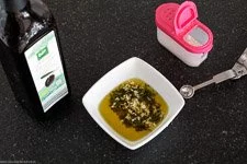 - In der Zwischenzeit kannst Du schon mal den Rosmarin fein hacken und den Knoblauch fein schneiden und beides mit dem Olivenöl vermengen. Mit Salz abschmecken und erst einmal zur Seite stellen.