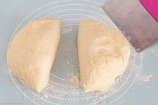 - Nachdem der Teig gegangen ist, teilst Du ihn auf zwei gleich große Teigstücke auf.