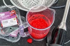 • Die frischen (oder aufgetauten TK-) Himbeeren pürierst Du mit einem Stabmixer.