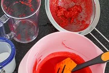 • Im Anschluss streichst Du sie durch ein Haarsieb damit die Kerne entfernt werden und Du nur noch ein feines Himbeermus hast. Mit 3 EL Zucker süßen.
