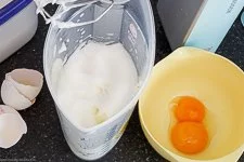 • Die 2 Eier trennst Du und schlägst das Eiweiß in einem fettfreien Behälter mit den Quirlen des Handmixers oder der Küchenmaschine sehr steif.