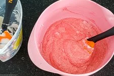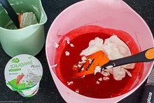HINWEIS: Beim Himbeer-Mousse setzt sich übrigens etwas vom Fruchtsaft der Himbeeren am Boden ab während es kühlt. Der Saft ist sehr lecker und erfrischend, entweder zum löffeln oder trinken.