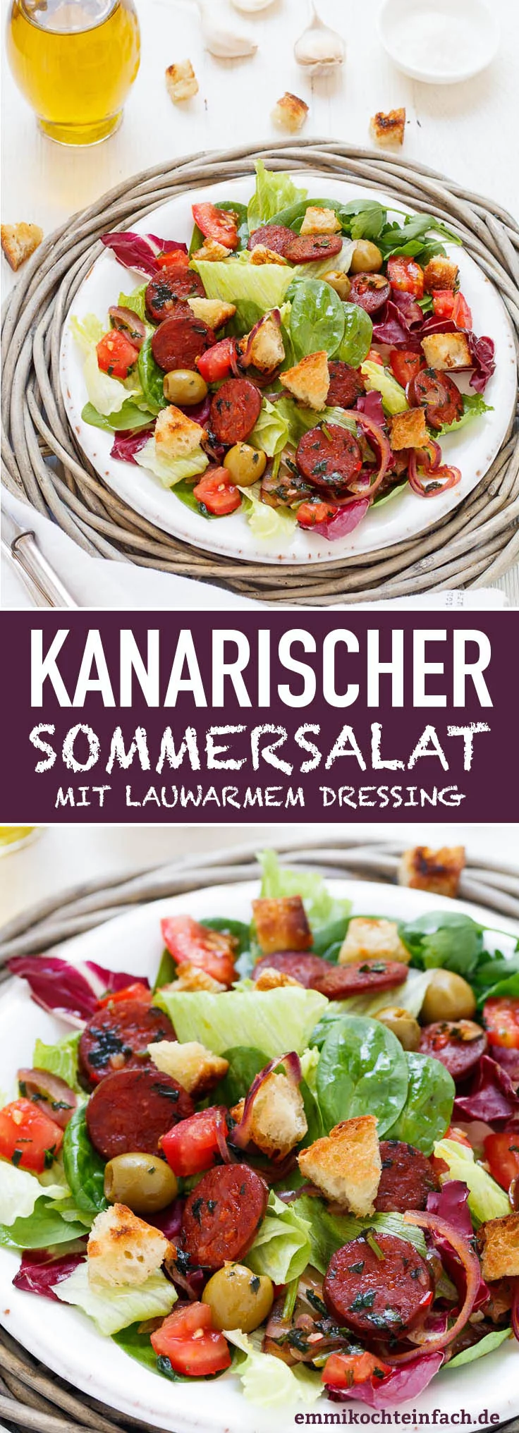 Der Urlaub ist und bleibt die schönste Zeit des Jahres, auch in diesen Tagen, und meistens bringt man sich auch eine Kleinigkeit als Andenken mit nach Hause. Mein Andenken an einen Urlaub auf den Kanaren vor einigen Jahren ist ein sommerlicher, spanischer Salat mit Chorizo und lauwarmem Dressing. Ich hatte ihn mehrmals in einem kleinen „Restaurante“ mit Blick aufs Meer gegessen. Unvergesslich.