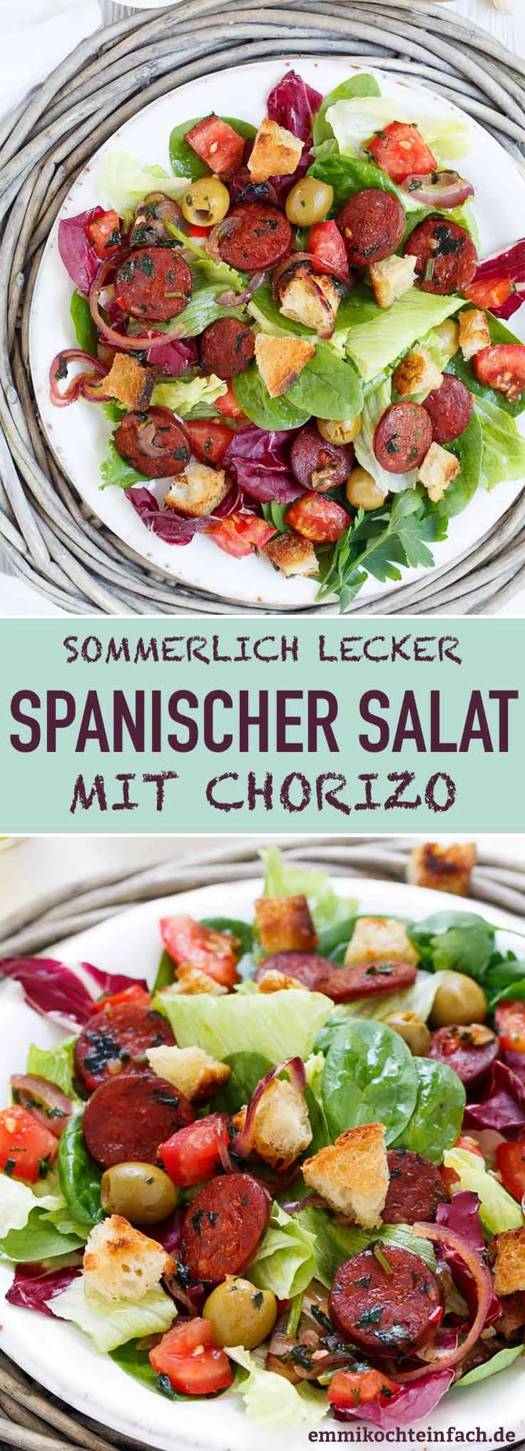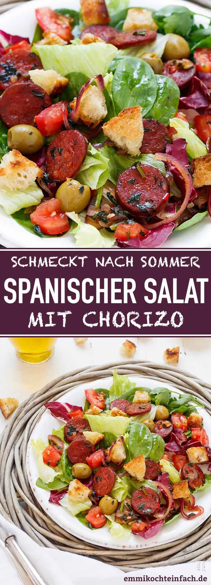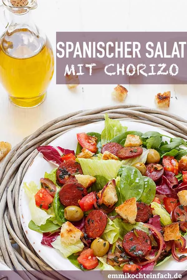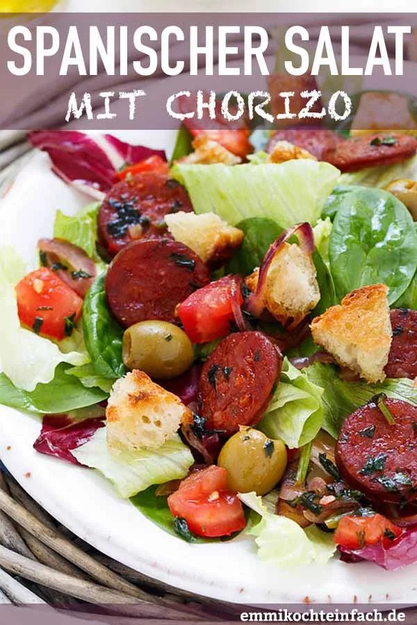 Weitere, köstliche Blattsalate neben spanischer Salat mit Chorizo sind mein mediterraner Brotsalat sowie mein griechischer Bauernsalat, die auch sommerlich schmecken und sich ideal fürs Grillbuffet eignen.