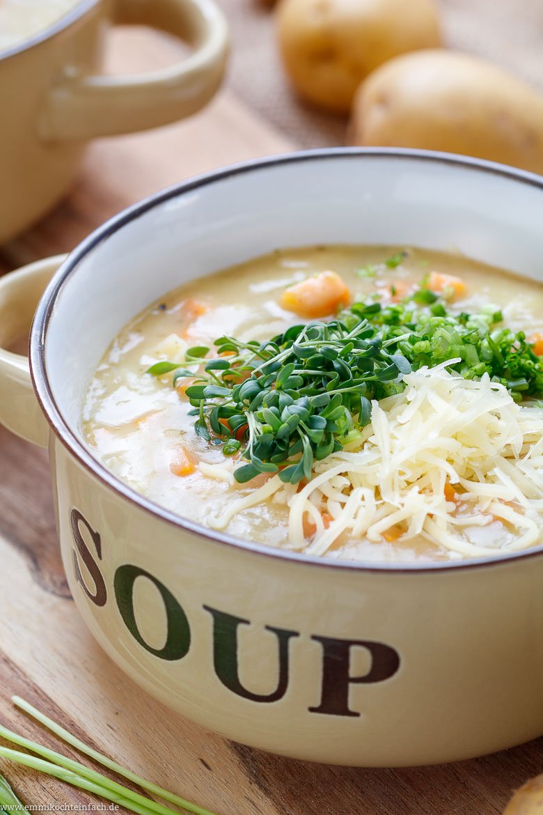 - Die cremige Suppe mit klein geschnittenem Schnittlauch und der Kresse sowie dem fein geriebenen Emmentaler servieren. Oder Wiener Würstchen wer nicht darauf verzichten möchte.