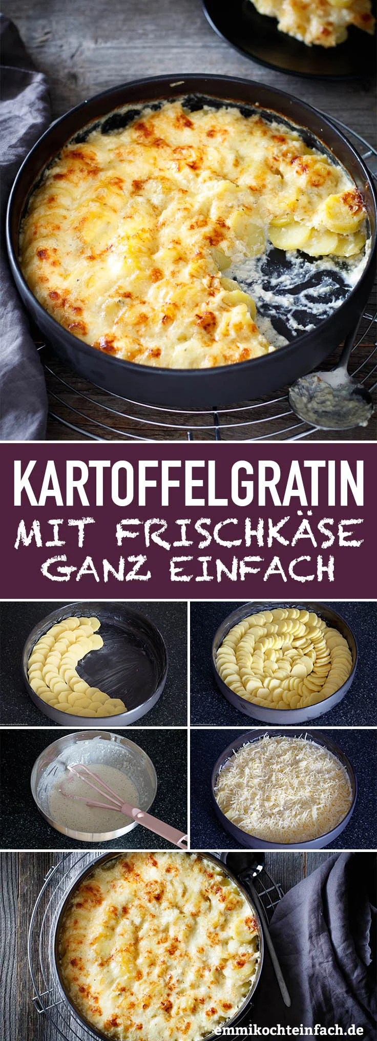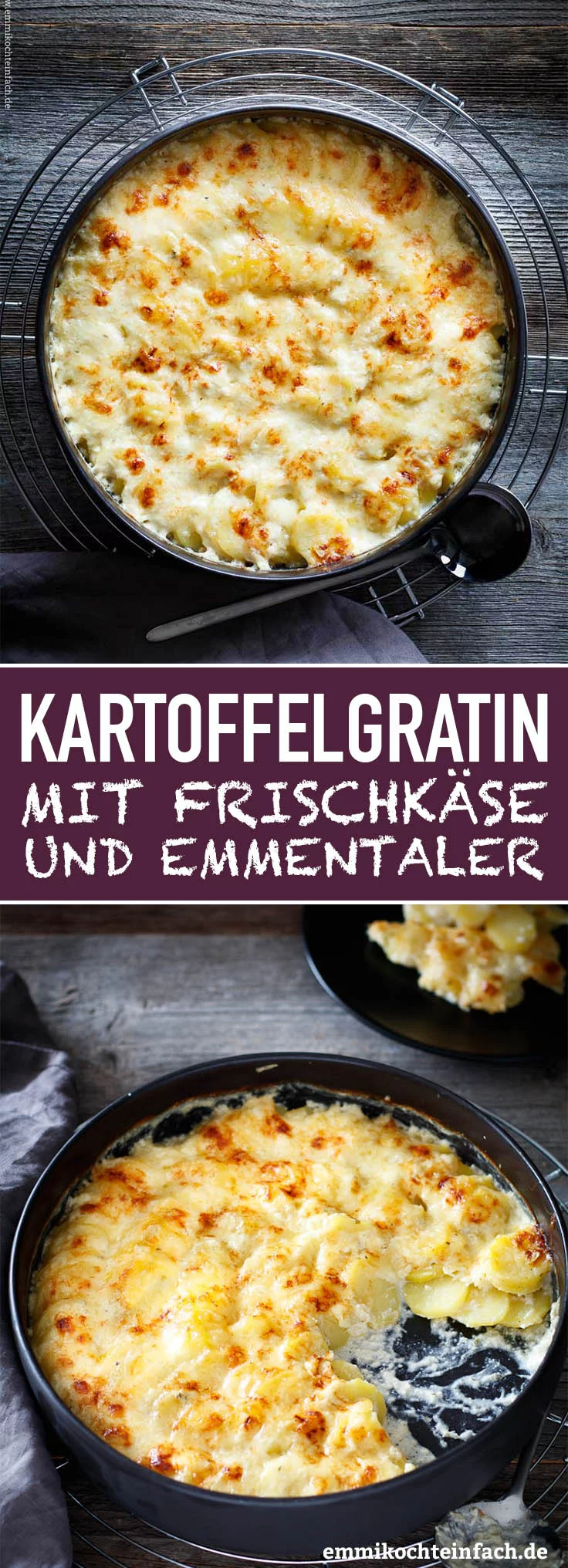 - Die Sahne-Frischkäse-Masse gießt du nun gleichmäßig über die Kartoffelscheiben in der Auflaufform und verteilst 20 g Butter in Flöckchen darüber. Die 100 g Emmentaler reibst du frisch mit einer Reibe und verteilst ihn ebenfalls gleichmäßig auf den Kartoffeln. Im vorgeheizten Backofen, auf der mittleren Schiene, ca. 45 Minuten backen.