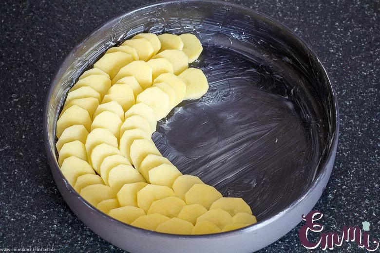 - Eine runde oder rechteckige Auflaufform mit ca. 1 TL Butter einfetten und die Kartoffelscheiben dachziegelartig arrangieren.