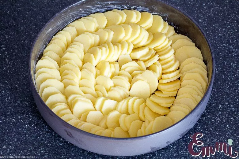 - Bei einer runden Auflaufform arbeitest du dich am besten von außen nach innen und schichtest die Kartoffelscheiben schneckenförmig im Kreis. TIPP: Bei rechteckigen Formen an der schmalen Seite beginnen und reihenartig einschichten.