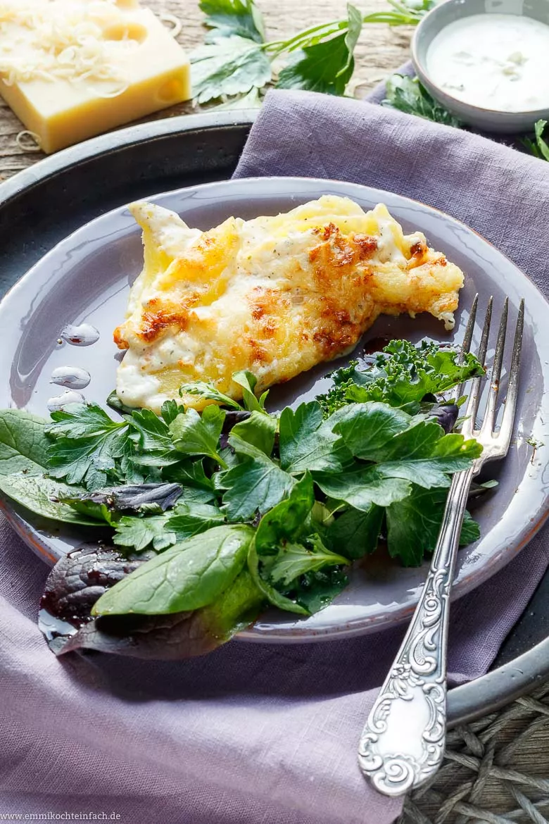 - Als vegetarisches Hauptgericht schmeckt es mit Salat besonders gut: Ich empfehle dir einen knackig grünen Blattsalat mit meinem cremigen French-Dressing-Rezept.
