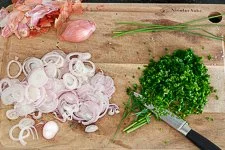 - In der Zwischenzeit die Schalotten in feine Ringe schneiden und den gewaschenen Schnittlauch in feine Röllchen.
