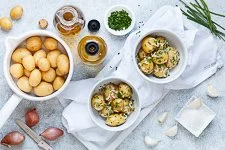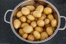 - 1,5 kg Drillingskartoffeln (sortierte kleine Kartoffeln) - mit Schale im Salzwasser gekocht, ca. 10 Minuten auskühlen lassen