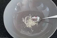 - Den Knoblauch fein schneiden, mit dem Meersalz in eine sehr große Salatschüssel (in die später alle Zutaten hinein kommen) geben und mit einem Esslöffel miteinander zerdrücken (wenn Du magst, kannst Du das auch in einem Mörser machen).