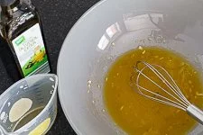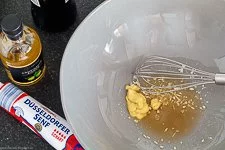 - Dann gibst Du den Senf, Sherry, Honig und weißen Balsamico-Essig dazu und vermengst mit dem Schneebesen alles gut miteinander.