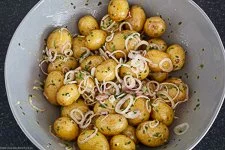 - Zum Schluss vermengst Du die Zutaten mit dem Dressing, sprich die gekochten Drillingskartoffeln die Schalotten und den Schnittlauch.HINWEIS: Die Dressing-Menge ist sehr großzügig angesetzt, da die Idee war beim Essen die kleinen Kartöffelchen darin zu zerdrücken.