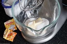 - Jetzt verrührst Du in einer Schüssel die weiche Butter, den Zucker, Vanillezucker und Backpulver cremig mit den Quirlen des Handmixers oder Deiner Küchenmaschine.