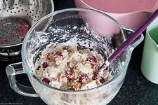 - Im Anschluss in der Reihenfolge die Brötchen-Stücke, die Kirschen und den Eischnee unterheben.