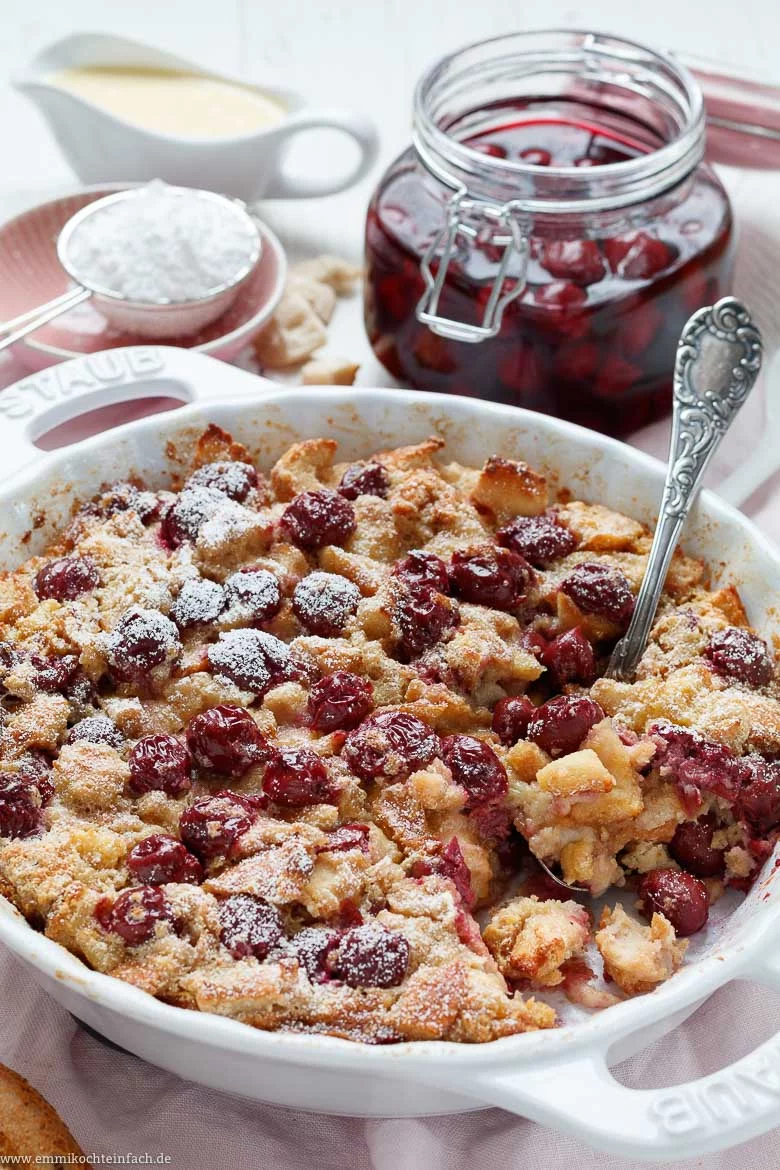 Wenn bei meiner Oma zum Beispiel zu viel Brötchen vom Vortag übrig geblieben sind war es klar! Es gab ihren leckeren Kirschmichel! Bei dem herrlichen Geruch aus dem Backofen lief mir schon im Vorfeld das Wasser im Mund zusammen. Kirschmichel ist deshalb MEIN Gericht aus Kindertagen, das so viele schöne Erinnerungen bei mir hervorholt. Ich bin wirklich sehr froh ihn wiederentdeckt zu haben, denn aus altbackenen Brötchen wird ganz einfach ein herrliches Süßspeisen-Gericht gezaubert, das auch meinem Männern hervorragend schmeckt.