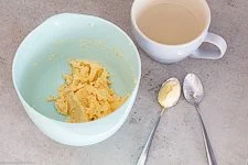 - Rechtzeitig vor dem Start, mindestens 30 Minuten, die 40 g Butter (gerne in Stückchen schneiden) und die 2 Eier aus dem Kühlschrank nehmen und zimmerwarm werden lassen, damit sich Butter und Eier später gut verbinden.