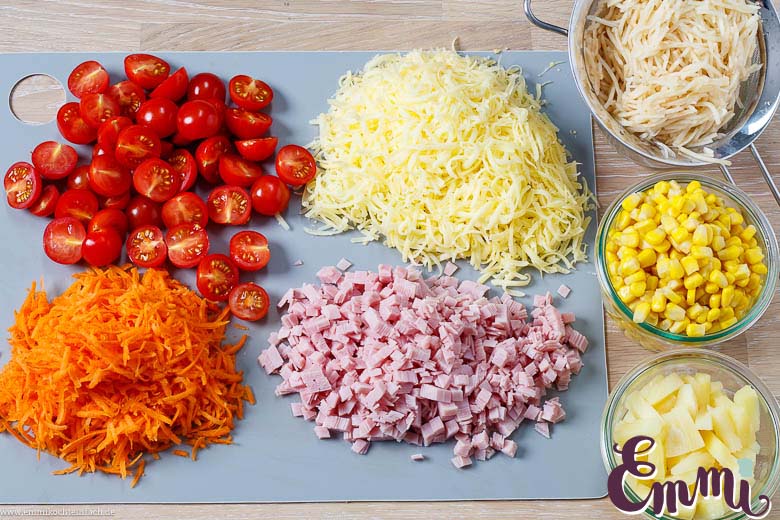 - Folgendes gießt du separat voneinander ab: 1 Glas Selleriesalat, 1 Dose Mais und 1 Dose Ananas. Die Ananas schneidest du in feine Stücke, die 250 g Cherrytomaten wäschst du ab und halbierst sie. 200 g Möhren schälen und raspeln. 200 g Kochschinken würfelst du fein und 150 g Gouda reibst du ebenfalls fein. TIPP: Wenn du keinen Sellerie magst, lass ihn gerne weg, aber er ergänzt den Geschmack unglaublich gut.
