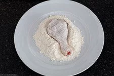 - Jetzt einen Hähnchenschlegel nach dem anderen in Mehl wenden, so dass er richtig schön mehlig ist.