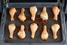 - Danach gibst Du die Hähnchenschlegel auf der zweiten Schiene von unten für 45 bis 60 Minuten in den Ofen. Die Garzeit hängt von dem Gewicht der Hähnchenschlegel ab.