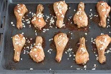 - Wenn die Hähnchenschlegel fertig gegart sind, so wie Du es magst, dann schaltest Du den Ofen aus, verteilst den Knoblauch auf den Hähnchenschlegeln und lässt sie in der Restwärme nochmal für 10 Minuten im Ofen.