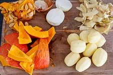 - Den Hokkaido-Kürbis (ungeschält) mit heißem Wasser abwaschen, trocknen, entkernen und in große Stücke teilen. Die Kartoffeln schälen und genauso wie die Zwiebel in grobe Stücke scheiden.