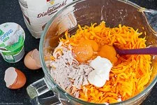 - Nun verrührst Du mit Deinem geraspelten Gemüse die 2 Eier, den Schmand und das Mehl bis sich alles gut miteinander verbunden hat.