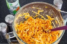 - Jetzt raspelst Du auf einer groben Reibe manuell oder mit Hilfe der Küchenmaschine den Kürbis, die Kartoffeln und die Zwiebel direkt in eine große Schüssel.