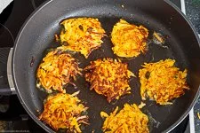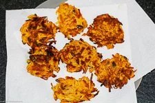 - Auf Küchenpapier abtropfen lassen und im vorgeheizten Ofen warmhalten, bis alle Puffer fertig gebraten sind.
