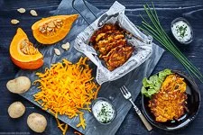 Kürbis Kartoffel Puffer mit Schnittlauch-Dip