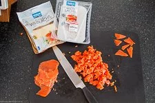 - Die 150 g Räucherlachs schneidest Du in feine Würfel. 6 klitzekleine Stücke hältst Du zurück für das Topping.