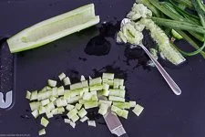 - Die Salatgurke schälen, längs halbieren und mit einem Teelöffel entkernen. Dann schneidest Du sie in ganz kleine Würfelchen.