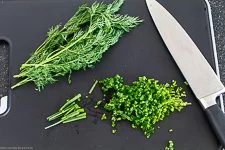 - Die 10 g Schnittlauch sowie 10 g Dill wäscht Du, trocknest sie ab und schneidest sie fein. Etwas Dill für das Topping zur Seite legen.