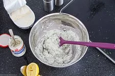 - Für die Frischkäse Creme rührst Du zuerst 100 g Frischkäse mit 40 g Sahnemeerrettich, 2 EL Zitronensaft und den geschnittenen Kräutern glatt. Mit Salz und Pfeffer und Zitronensaft nach Belieben weiter abschmecken.