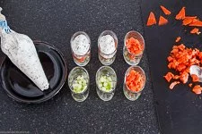 - Dann schichtest Du in jedes Glas zuerst eine Schicht Salatgurken-Würfelchen, dann kommt die Schicht mit den Räucherlachs-Würfelchen und die Frischkäse-Sahne-Meerrettich-Creme oben drauf. TIPP: Du kannst die Frischkäse-Sahne-Meerrettich-Creme auch mit einer Spritztüte auf die Gläser verteilen.