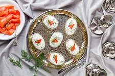 - Jetzt noch mit einem kleinen Lachs-Stückchen und Dill verzieren. Bis zum Servieren in den Kühlschrank stellen, das kann ohne weiteres mehrere Stunden sein. Ich wünsche Dir einen guten Appetit.