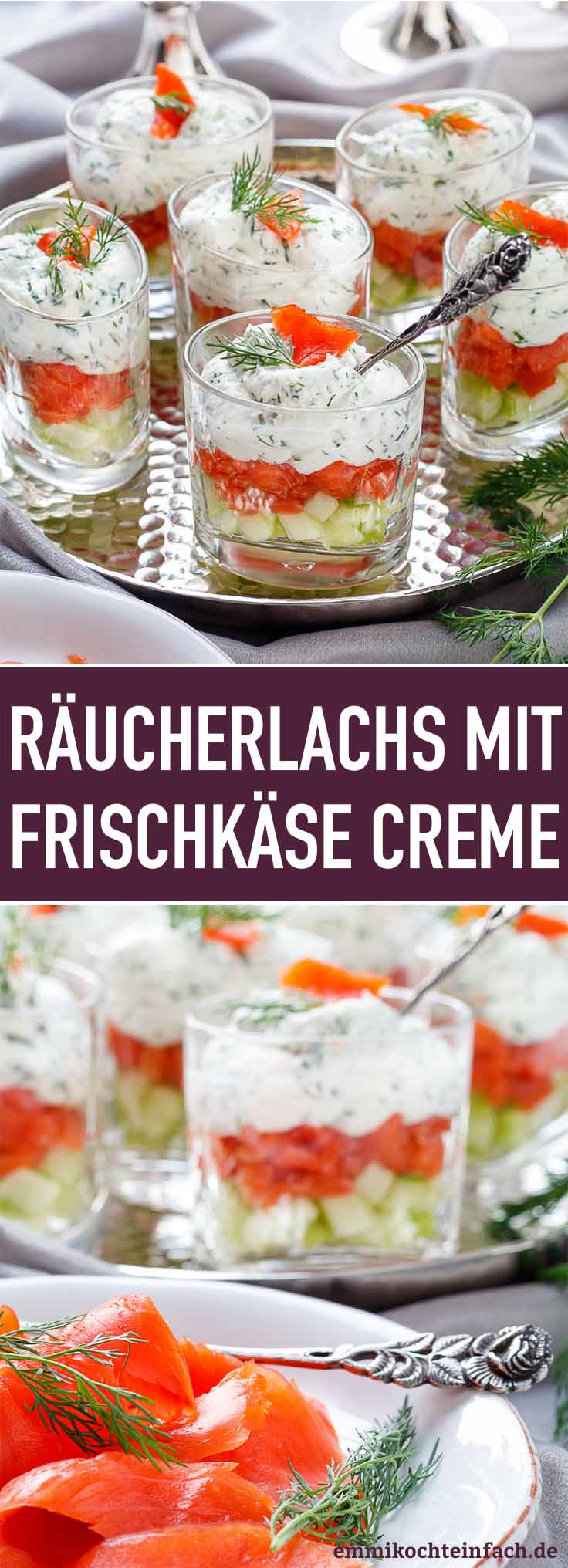 - Dann schichtest Du in jedes Glas zuerst eine Schicht Salatgurken-Würfelchen, dann kommt die Schicht mit den Räucherlachs-Würfelchen und die Frischkäse-Sahne-Meerrettich-Creme oben drauf. TIPP: Du kannst die Frischkäse-Sahne-Meerrettich-Creme auch mit einer Spritztüte auf die Gläser verteilen.