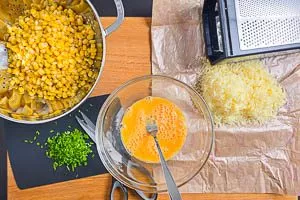 - Geriebener Käse hält die Maiskörner beim Ausbacken der Puffer an Ort und Stelle, ich verwende am liebsten würzig-aromatischen Emmentaler oder Bergkäse.