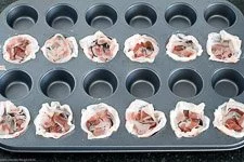 - Dann füllst Du die Brotmischung mit zwei Teelöffeln zum Pancetta in die Muffin-Mulden und drückst die Masse etwas fest.