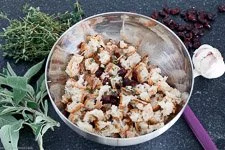 - Jetzt schneidet oder zupfst Du das Ciabatta Brot klein, hackst Thymian und Salbei fein und schneidest den Knoblauch ebenfalls fein, zerhackst grob die Soft-Cranberries und vermengst alles miteinander in einer Schüssel.