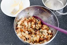 - Jetzt gibst Du die zerlassene Butter und das verquirlte Ei zur Chiabatta-Cranberry-Mischung, würzt alles noch einmal kräftig mit Salz und Pfeffer und vermengst es miteinander.