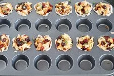 - Danach fettest Du 12 Mulden Deines Mini-Muffin-Blechs mit etwas Butter ein und legst die Pancetta-Scheiben in die Vertiefungen. Hinweis: Die Pancetta Scheiben werden in der Regel sehr dünn geschnitten und es ist deshalb manchmal etwas Fummelei die Mulden fein säuberlich auszukleiden, weil der Pancetta verrutscht oder verknubbelt. Das ist aber überhaupt nicht tragisch, da die Brotmasse die kleinen Lücken schließen wird.