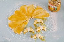 - Nun jedes "Tortenstück" mit der breiten Seite beginnend zu einem Hörnchen aufrollen. HINWEIS: Dabei wird der Apfelmus am Rand etwas rausquellen, das ist aber gar nicht schlimm sondern sehr lecker 😉 .